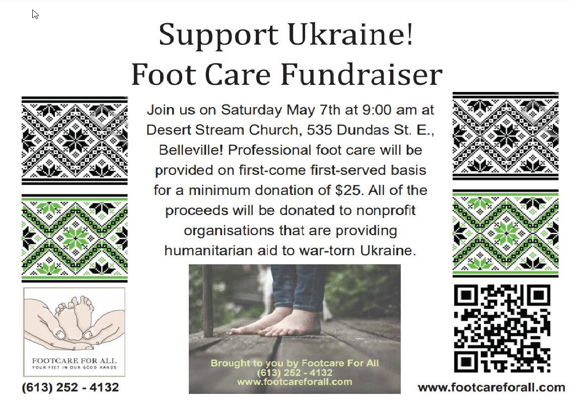 As you well know, Ukraine is being invaded by Russia and its people are suffering. Many are now refugees and those that remain in Ukraine need food and medical supplies to survive. On May 7th, 2022 Footcare for All is hosting a Fundraiser to support Ukraine at Desert Stream Church, 535 Dundas Street East, Belleville. It will run 9 am to 5 pm. Three or more experienced foot care nurse will be providing professional foot care on a first-come first-served basis. Donations will be $25 minimum and will be accepted in the form of cash or cheque. The proceeds will be going to Samaritan’s Purse, nonprofit Canadian organization that is establishing field hospitals near big cities in Ukraine, such as Lviv.